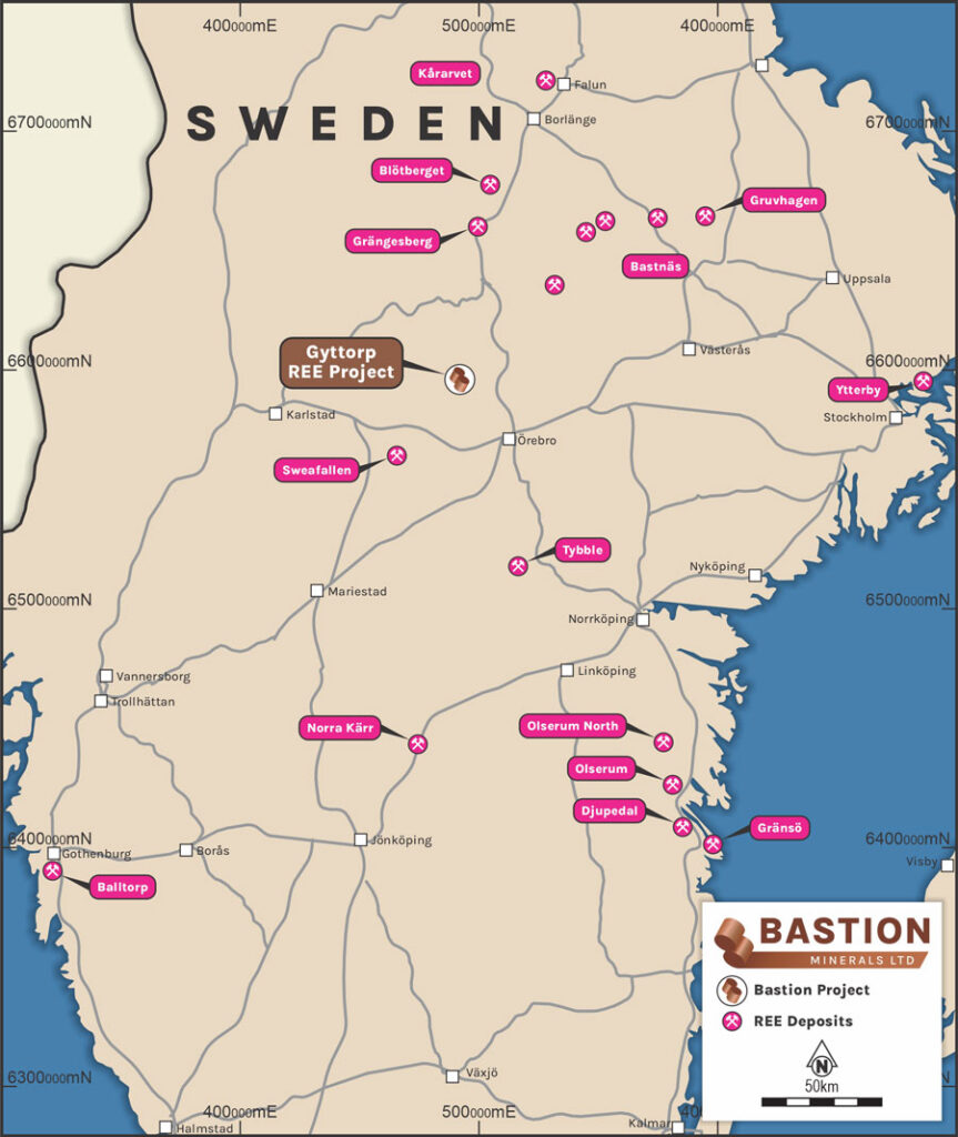 Within Bastion’s Gyttorp Project there are 50 samples which have comprehensive REE analyses and of those, nine returned highly anomalous grades of over 1000ppm TREO.